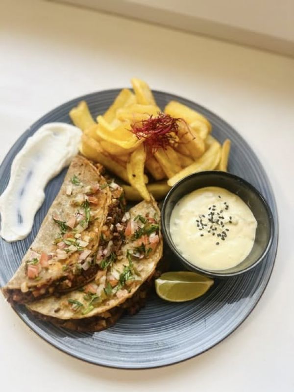 4. PULLED PORK TACOS - tortilly s trhaným vepřovým masem, cheddarem a zeleninou, hranolky, tatarka 134199 Kč