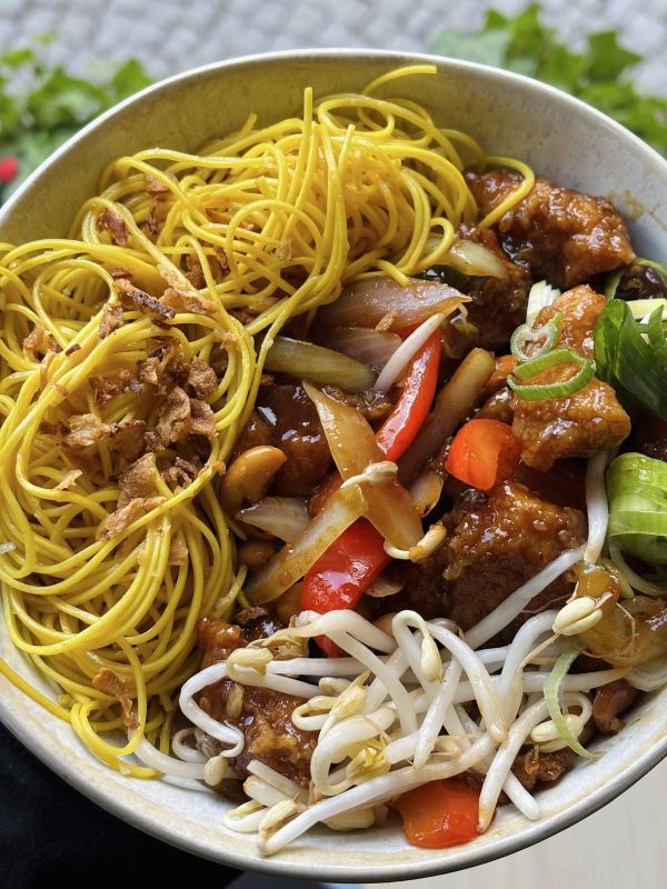 Obědový set: 200ml Česnekový krém, KAI PAD MED MAMUANG - křupavé kuřecí kousky s kešu oříšky, zeleninou, restované pšeničné nudle s česnekem, dezert 14671114199 Kč
