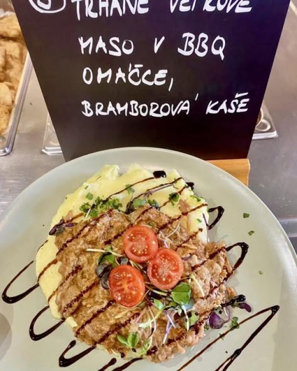 5. Trhané vepřové maso v BBQ omáčce, bramborová kaše