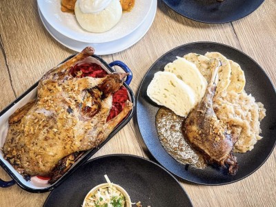 1. Plněný bramborový knedlík uzeným masem, dušené zelí