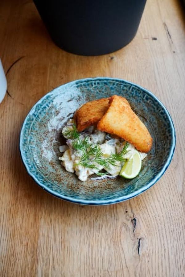 VÁNOČNÍ SPECIÁL - Smažený candát, bramborový salát s bílým jogurtem, majonézou, červenou cibulí a koprem250 Kč