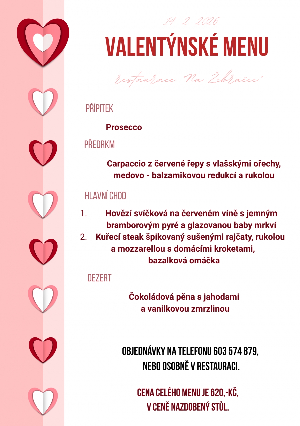 Srdečně Vás zveme na Valentýnské menu v sobotu 14. 2. 2026, od 17:00, nutná rezervace stolu na telefonu 603 574 879.