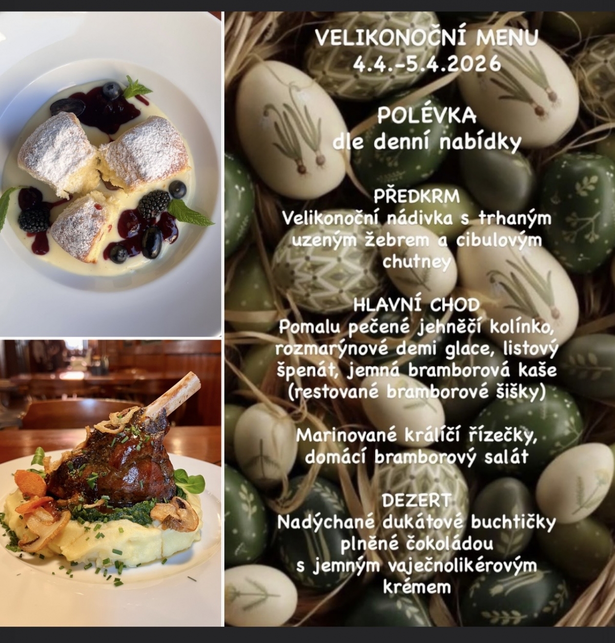 ..Přijďte si užít sváteční atmosféru a ochutnat naše speciální velikonoční menu, plné tradičních chutí a poctivé domácí kuchyně. Připravili jsme pro vás sváteční dobroty, které potěší každého milovníka dobrého jídla.