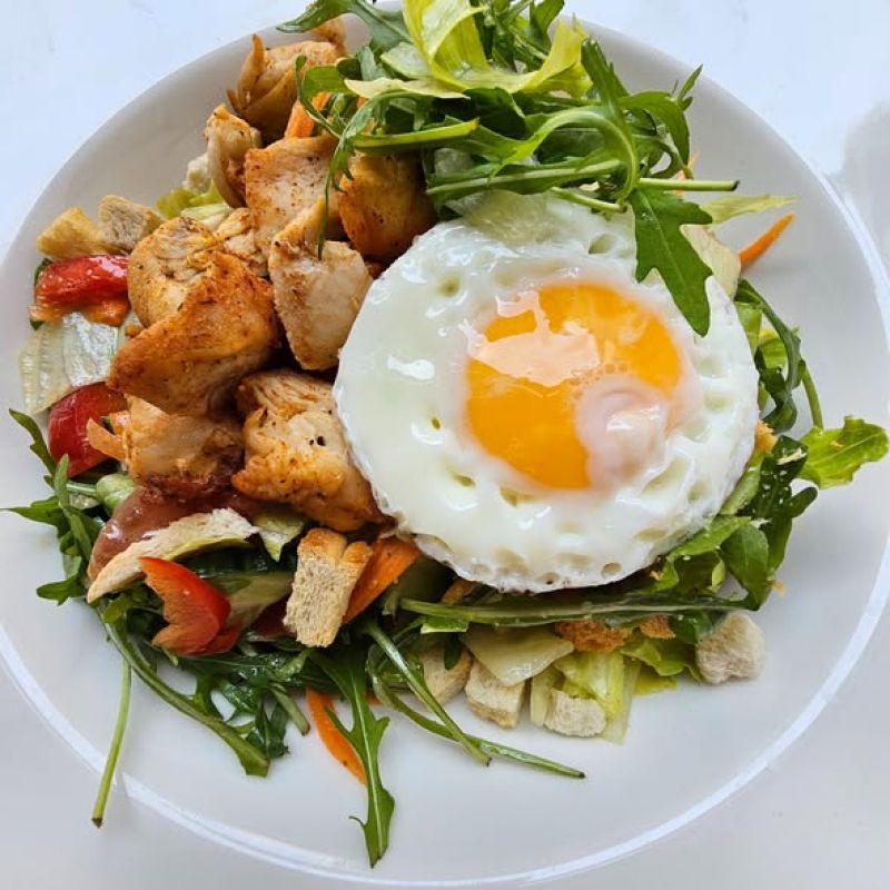 3. 300g Zeleninový salát s medovo - hořčicovým dresinkem, sazeným vejcem a kuřecím masem, krutony 13910165 Kč