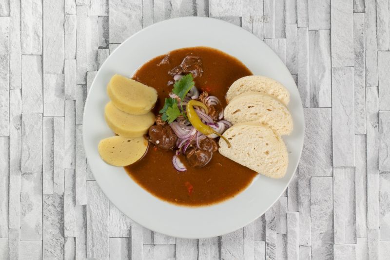 12. dl Dragounský vepřový marš (vepřové maso, cibule), bramborový knedlík 139150 Kč