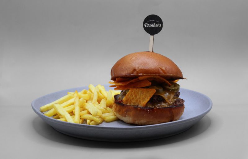 7. Sweet chilli SMASH burger DOUBLE - hovězí maso, sweet chilli mayo, cheddar, jalapeño, nachos, hranolky249 Kč