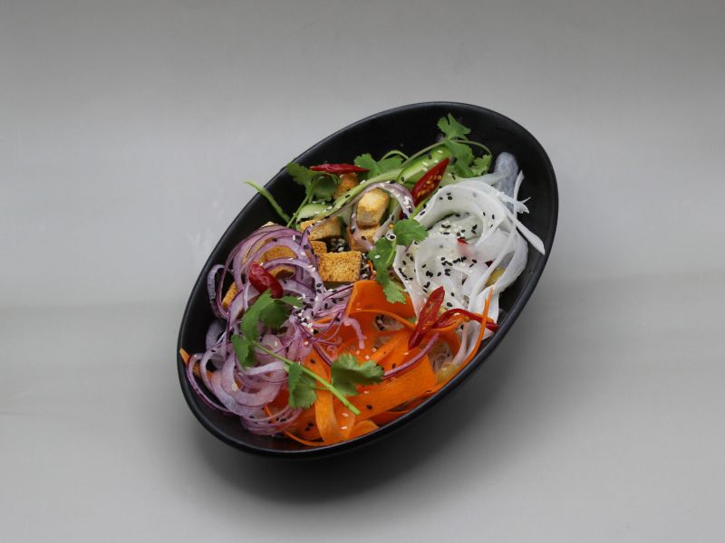 4. Tofu Poke - okurek, bílá ředkev, mrkev, petrželka, cibule, rýžové nudle, edamame, chilli, sezam, sója (1/ 6/ 11)169 Kč