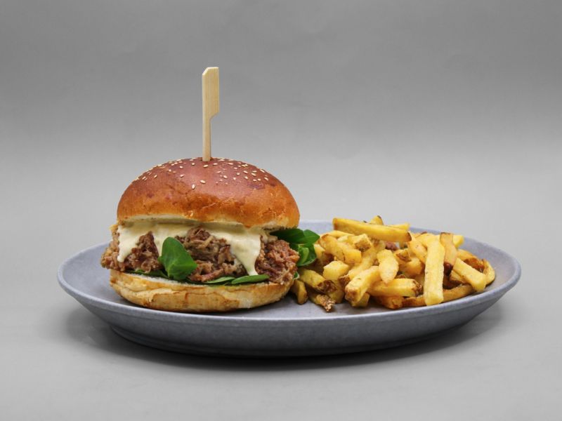 7. Trhák burger Velký & Hranolky - Trhané maso, polníček, majonéza z pečeného česneku (1/ 3/ 7/ 10/ 11)259 Kč