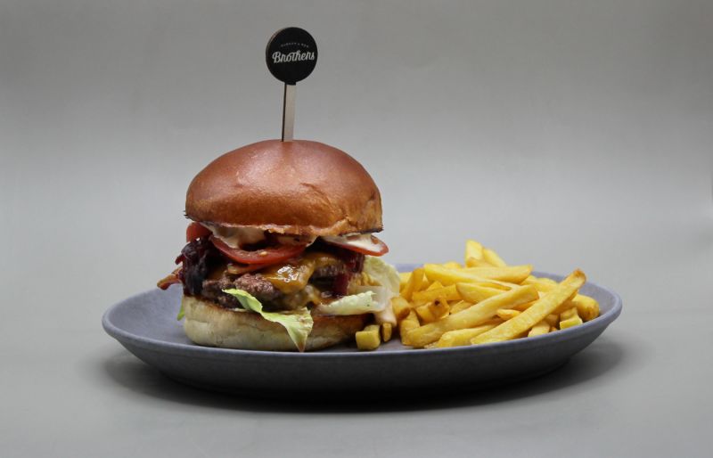 8. Burger Klasik double smash & Hranolky - hovězí maso z mladého býčka, grilovaná slanina, cheddar, rajče, švestkové chutney, salát, brothers dresink (1/ 3/ 7/ 10/ 11)249 Kč