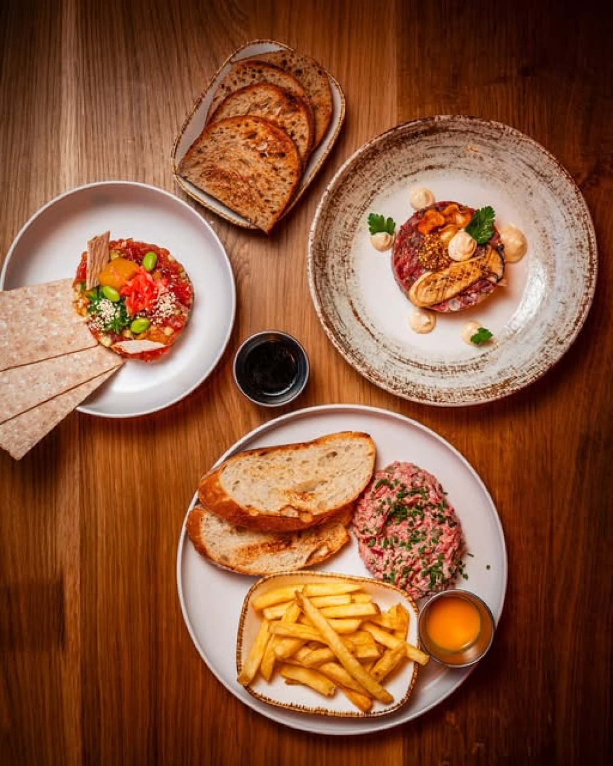 hovězí, kapary, šalotka, dijonská marináda, žloutek, hranolky, ciabatta