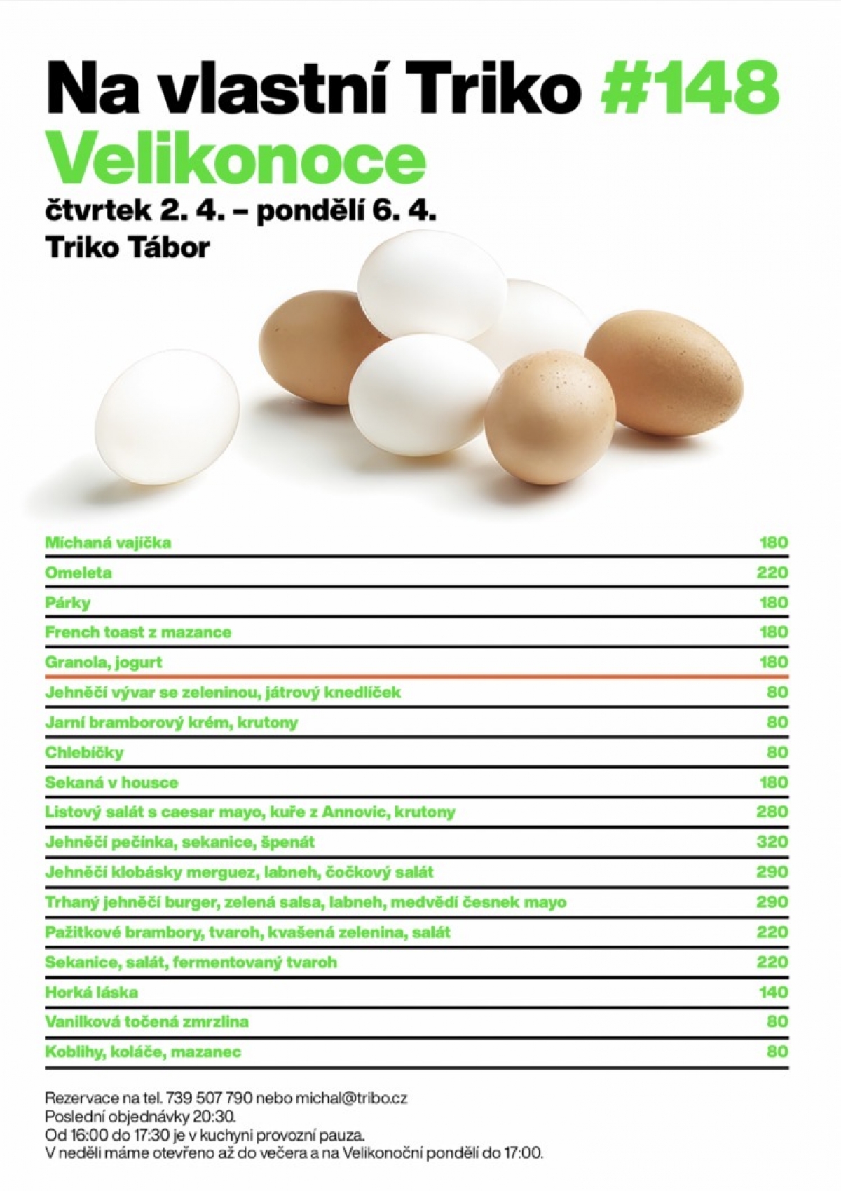 salát z farmy Mezi řádky s kuřetem z Annovic, sekanou v naší housce, nové brambory s fermentovaným tvarohem, sekanici, horkou lásku a naše klasické snídaně, koblihy a koláče.