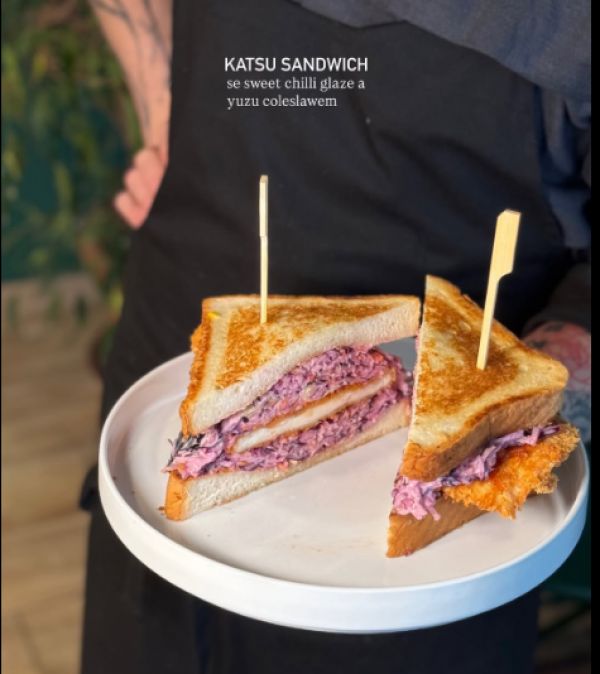 1. KATSU SANDWICH toastový chléb z pekařství Křížákovi, kuřecí řízek v panko strouhance, sweet chilli glazé, yuzu coleslaw 13710230 Kč