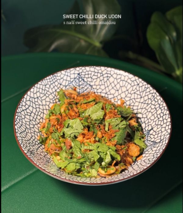 2. SWEET CHILLI DUCK UDON restované udon nudle, naše sweet chilli omáčka, trhané kachní maso, rýžový ocet, jarní cibulka, koriandr, smažená cibulka, pražený sezam 1611220 Kč