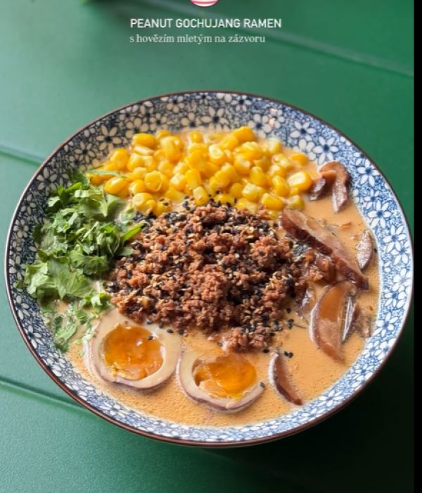 3. PEANUT GOCHUJANG RAMEN silný drůbeží vývar, peanut gochujang taré, ramen nudle, hovězí mleté maso se zázvorem, čajové vejce, marinované shiitake, máslová kukuřice, koriandr, pražený sezam 135611295 Kč