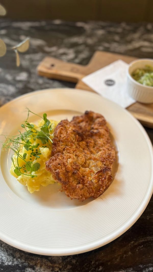 4. SMAŽENÁ TRESKA V BYLINKOVÉ STROUHANCE |150 g|treska tmavá|bylinková strouhanka|vařené brambory|domácí tatarská omáčka|189 Kč