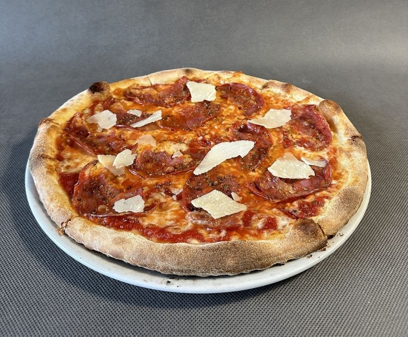 • 1. Pizza Florencia-tomaty, mozzarella fior di latte, slanina, brokolice