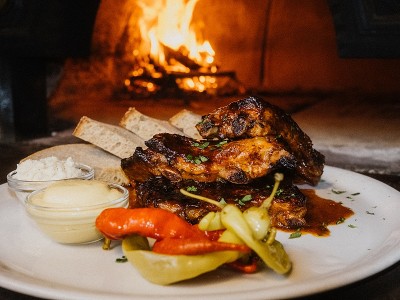 4. Insalata con gamberi-směs listových salátů,, restované krevety s bylinkami, smažená cibulka, domácí dressing ze zakysané smetany s koprem179 Kč