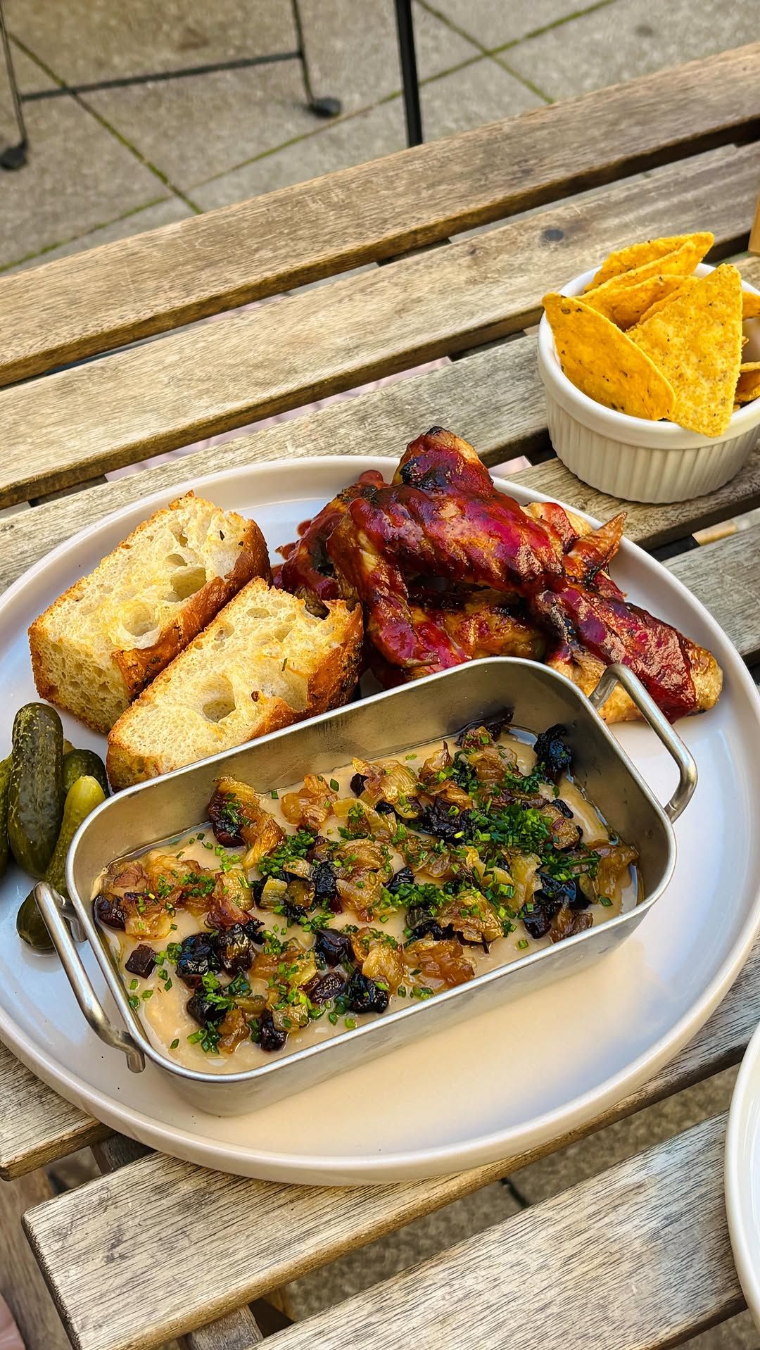 2. Platter 2: Uzené vepřové žebro, hot honey mac & cheese, mango chilli mayo, kyselá cibule, bylinkové máslo255 Kč