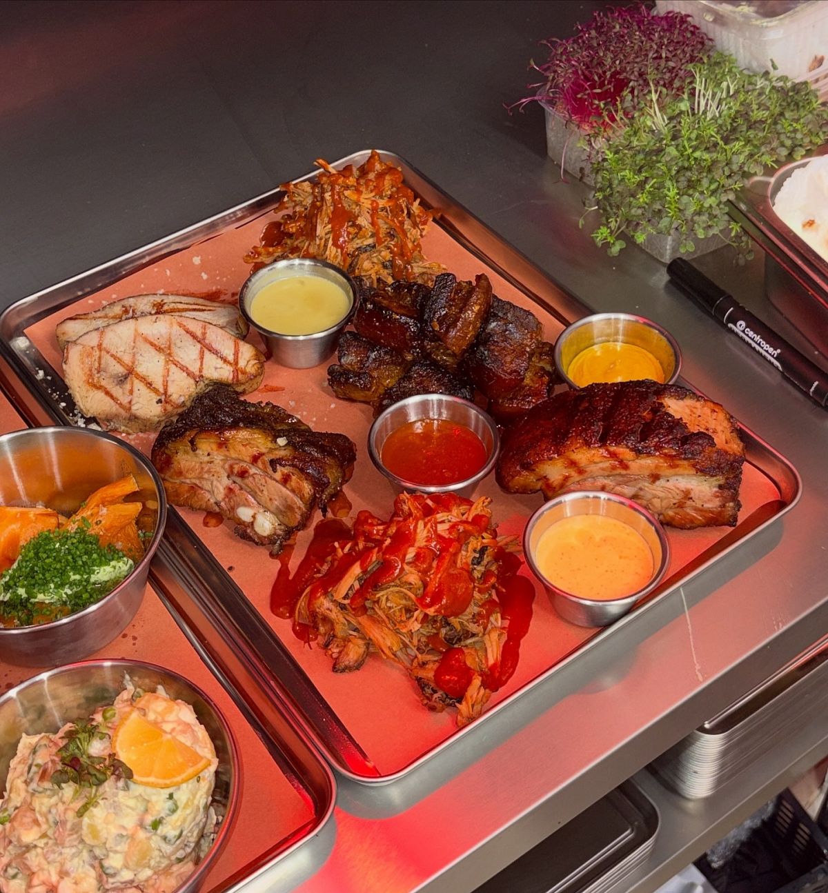 1. Platter 1: Uzená vepřová plec, grilovaný batát s bylinkovým máslem, kyselý salát s koriandrem, meruňková BBQ255 Kč