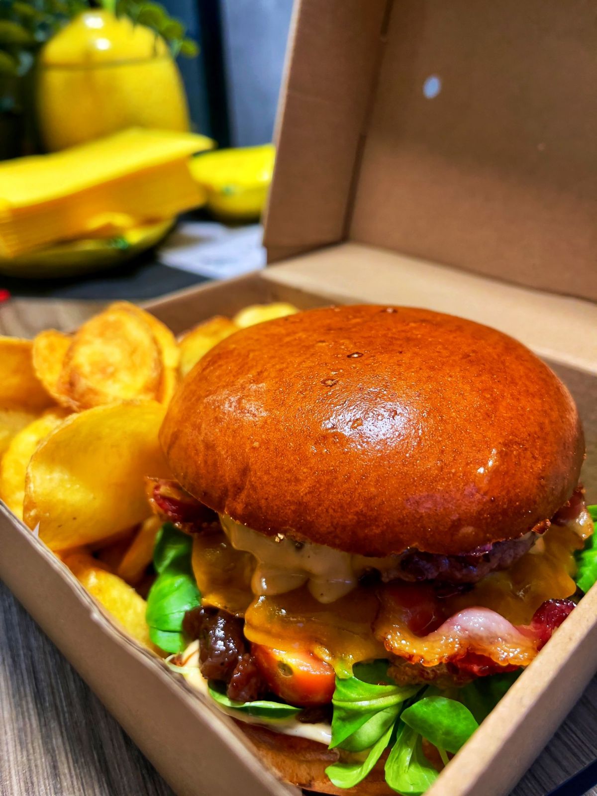 1. Goodies Burger 2x 90g hovězí smash, cibulové chutney, čedar, slanina, rajče, naše mayo240 Kč