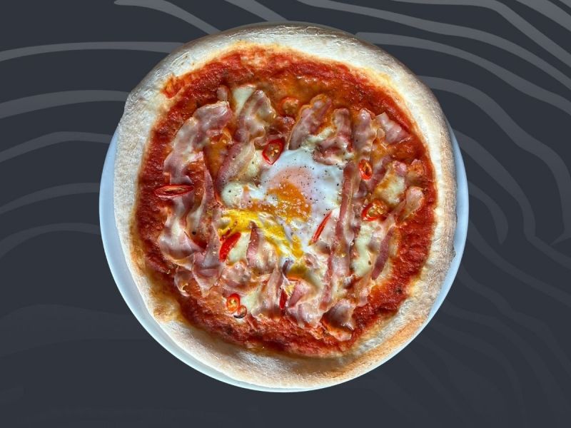 • 6. Pizza Ungerese s rajčatovým sugem, mozzarellou, pancettou, vejcem a feferonkami