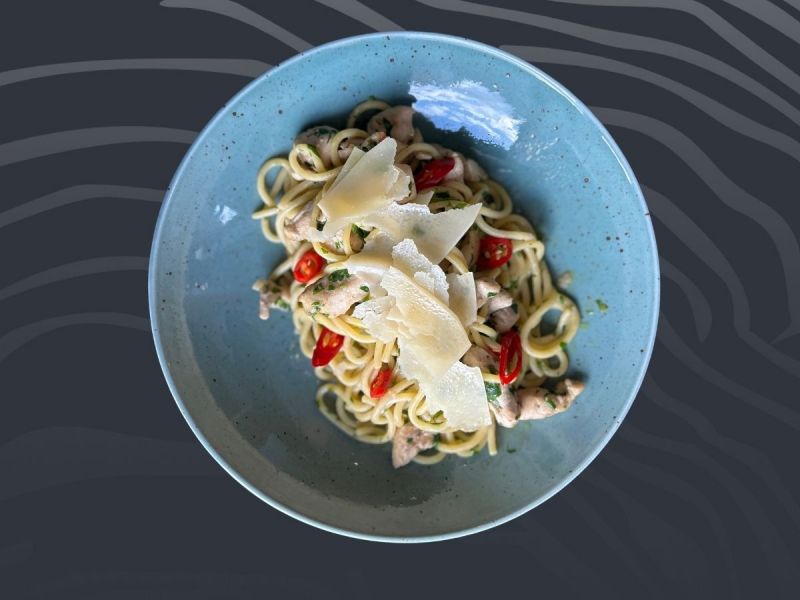 • 2. Spaghetti aglio olio e pollo s česnekem, feferonkou, kuřecím masem a parmazánem