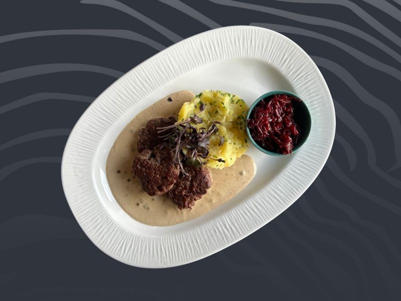• 3. Biftečky s pepřovou omáčkou, šťouchaným bramborem a salátem z červené řepy