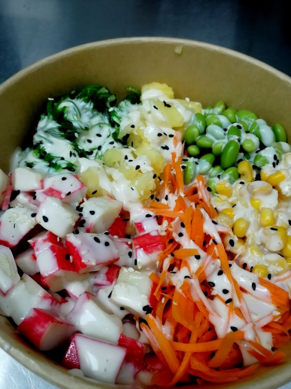 7. Poke Bowl Surimi - sushi rýže, marinované Surimi v poke omáčce, edamame fazole, wakame salát, ananas, mrkev, kukuřice, sezam a naše medová majonéza (jídlo je podáváno chlazené)210 Kč