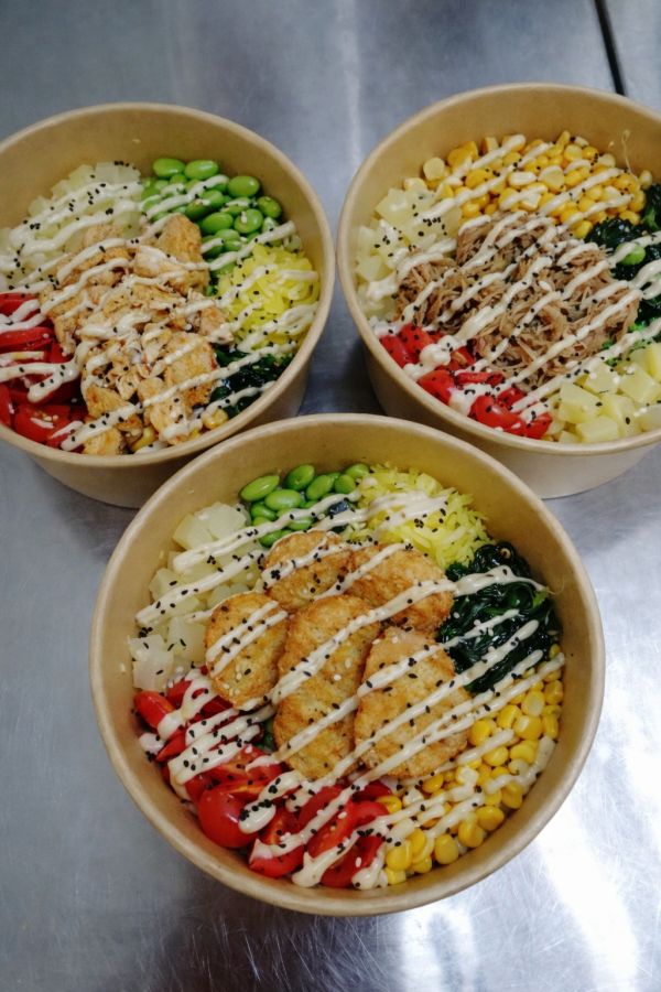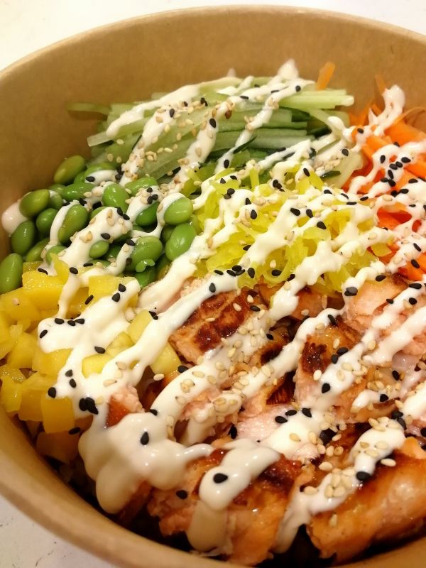 6. Poke Bowl grilovaný Norský losos - sushi rýže, marinovaný grilovaný Norský losos, edamame fazole, takuan ředkev, mango, okurka, mrkev, sezam a naše medová majonéza (jídlo je podáváno chlazené)220 Kč