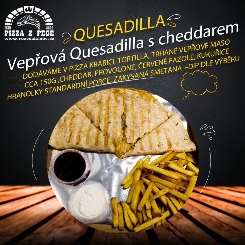 3. Menu 3 vepřová quesadilla s cheddarem - Dodáváme v pizza krabici, tortilla, trhané vepřové maso cca 150g, cheddar, provolone, červené fazole, kukuřice, hranolky standardní porce, zakysaná smetana + dip Tatarka190 Kč