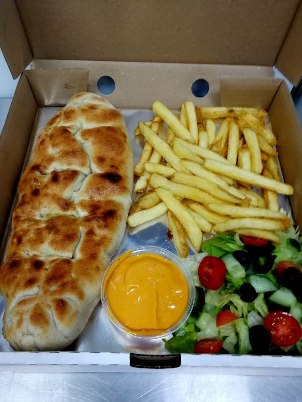 2. Menu 2 Stromboli trhan - (celková váha s přílohami cca 600g) zatočené a naplněné těsto, upečené naohni, jemná BBQ omáčka, cheddar, mozzarella, trhané vepřové maso. hranolky, zelenina + dip French150 Kč