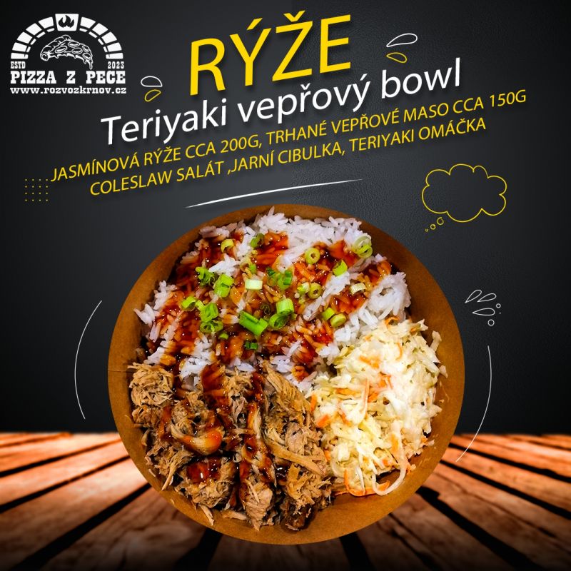 1. Menu 1 Teriyaki vepřový bowl - Jasmínová rýže cca 200g, coleslaw salát, jarní cibulka, teriyaki omáčka vepřové maso cca 150g169 Kč