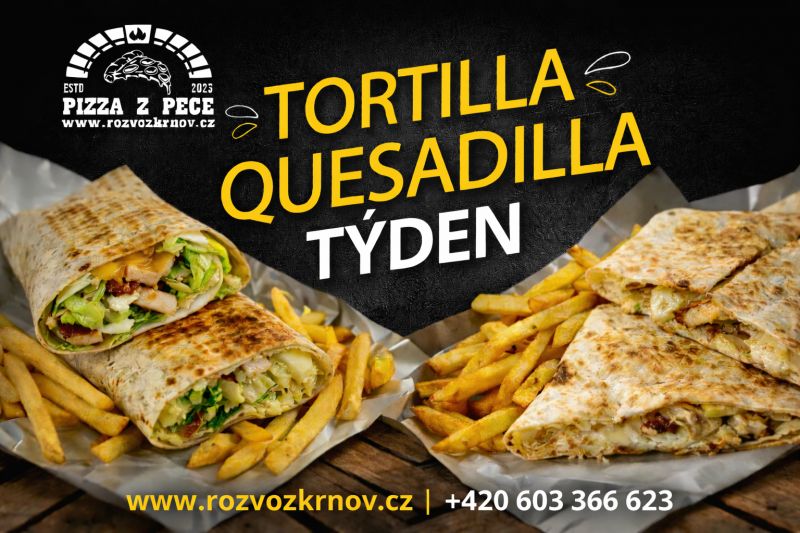 3. Menu 3 Vepřová Quesadilla s cheddarem - Dodáváme v pizza krabici, tortilla, trhané vepřové masocca 150g, cheddar, provolone, červené fazole, kukuřice, hranolky standardní porce, zakysaná smetana +dip sweet chilly 1, 3, 7, 10199 Kč