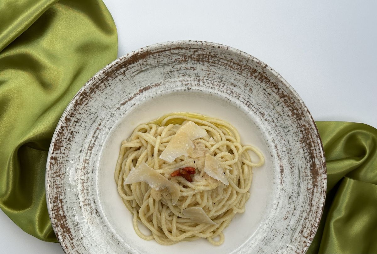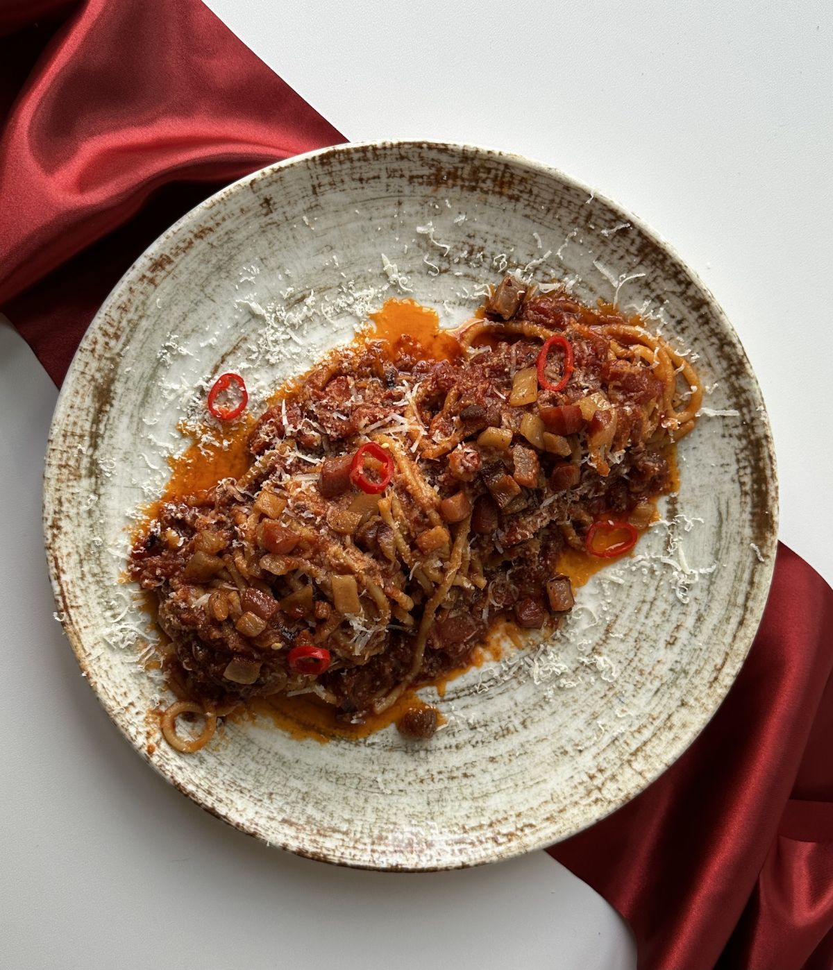 4. Spaghetti con ‘nduja e salsa di pomodoro (Špagety s pikantní kalábrijskou ‘ndujou v rajčatové omáčce, červená cibule, pecorino, stracciatella)165 Kč