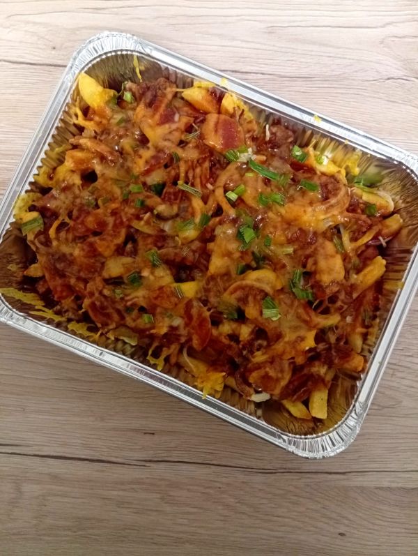 • 4. 650 g miska plná chuti s trhaným vepřovým masem s jelapeňos papričkami (vepřové trhané maso, hranolky, BBQ omáčka, chedar)