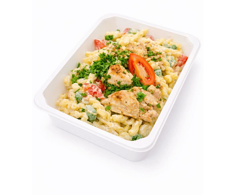 • 8. B3 400g Těstovinový salát se zeleninou a smaž. kuř. křídly obalenými v kukuřičných lupíncích