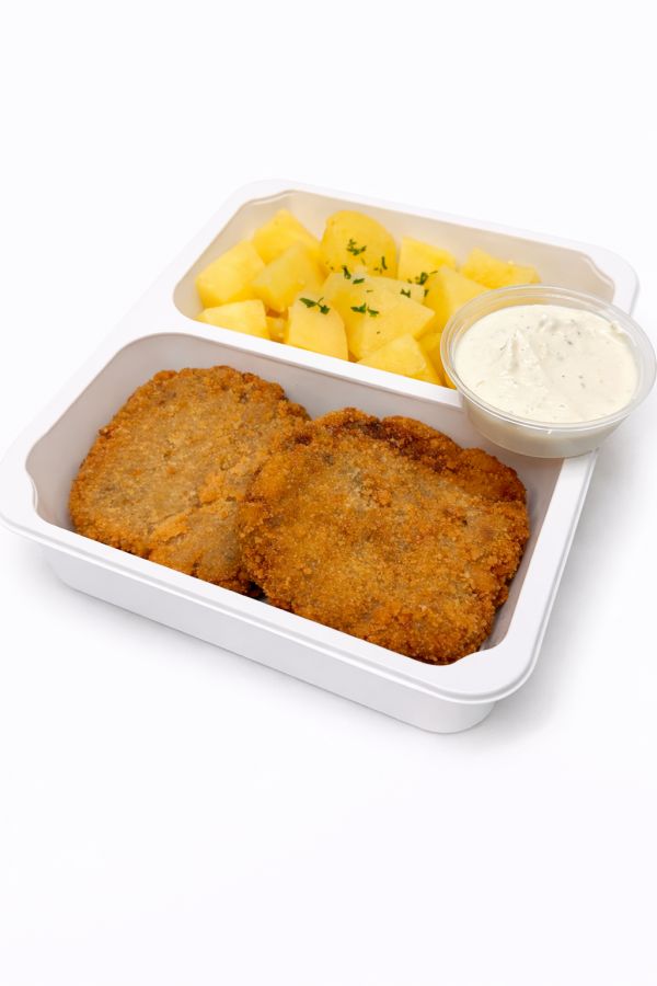 • 4. 150g Smažený kuřecí řízek, vařený brambor, okurka