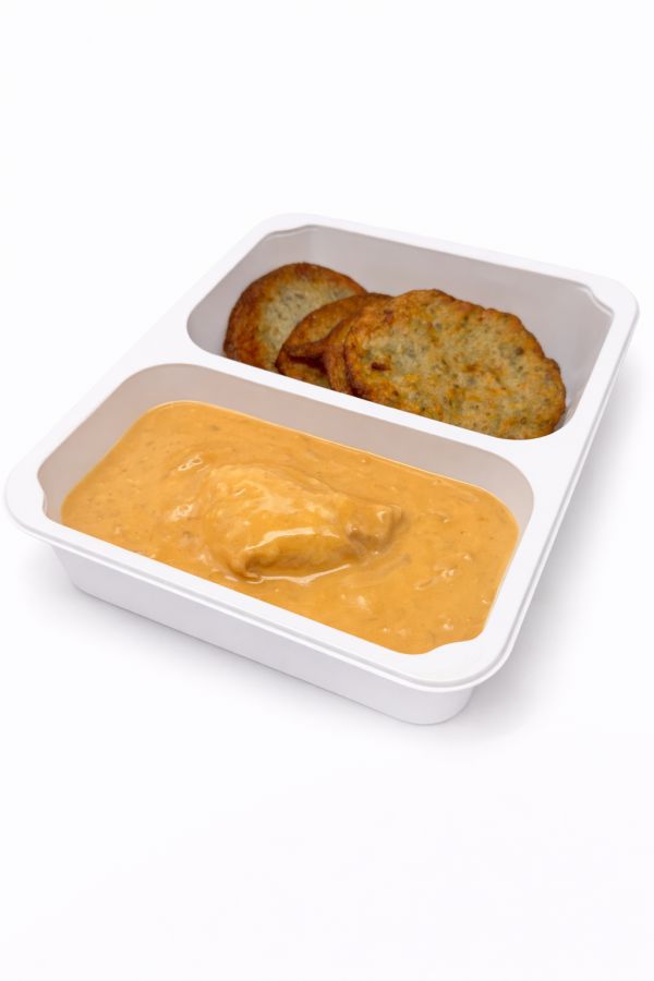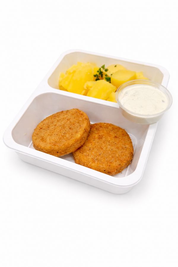 • 1. 150g Brokolicové karbanátky s mletým masem, vařený brambor, tatarka