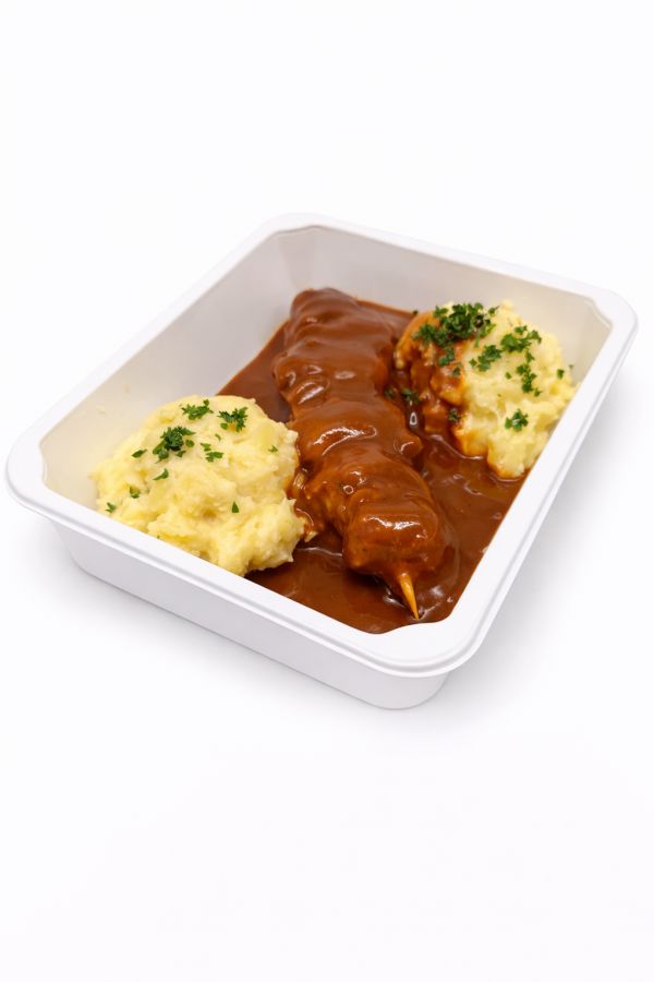 • 10. 200g Špíz z kuřecího stehenní a vepř. panenky, BBQ omáčka, šťouchaný brambor