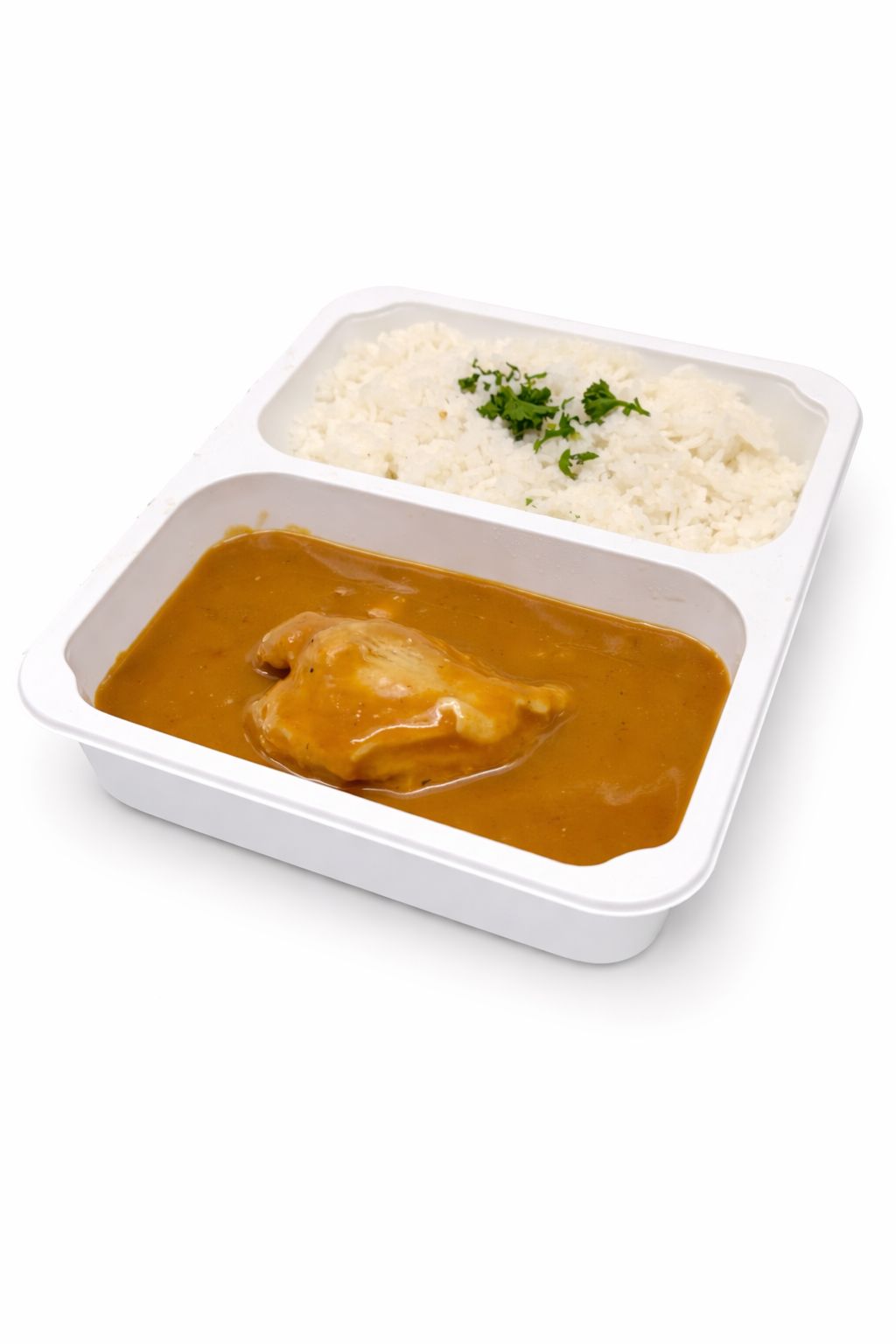 • 2. 130g Kuřecí stehenní kousky s rajčaty a paprikami, dušená rýže
