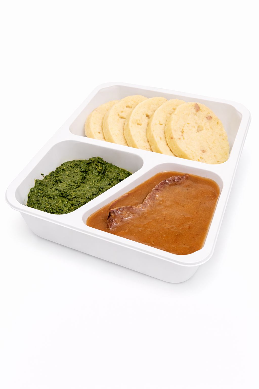 • 8. 150g Vepřové výpečky na slanině, špenát, bramborový špalík