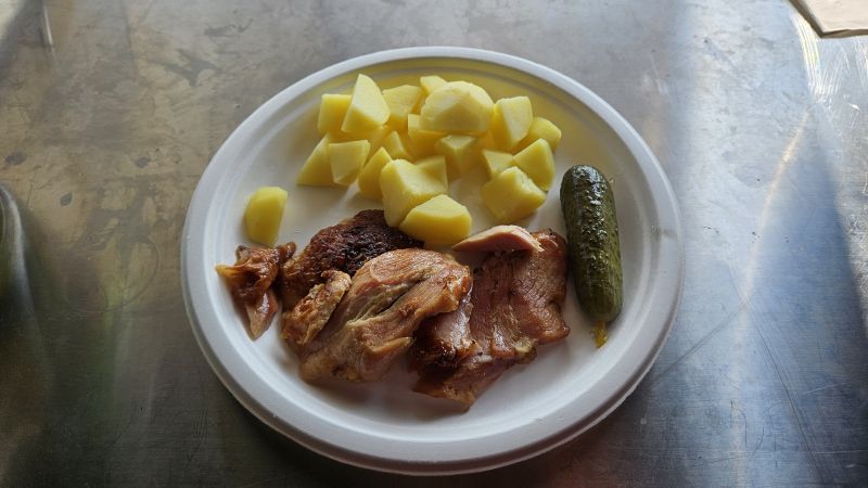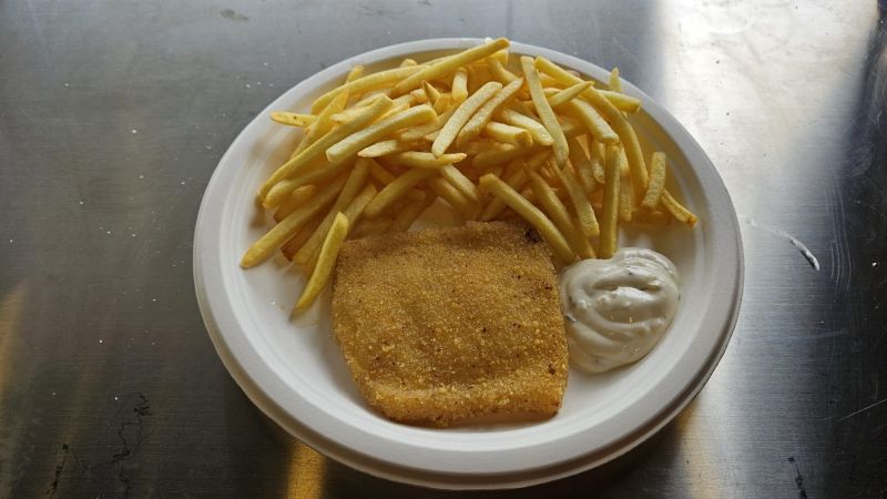 7. Smažené kuřecí stripsy, bramborový salát /brambory/150 Kč