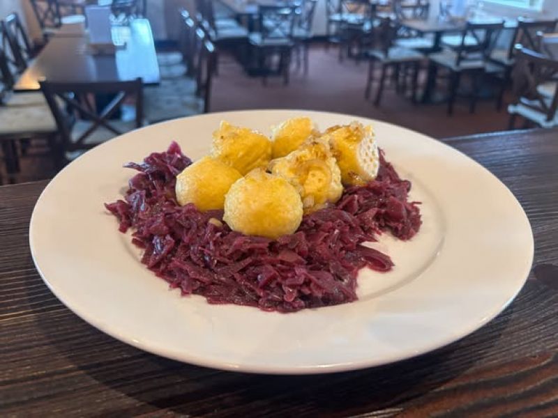 Kuře ala kachna, červené zelí, bramborový knedlík