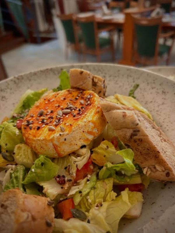 Grilovaný hermelín s lehkým asijským salátem a limetkovou majonézou, bagetka