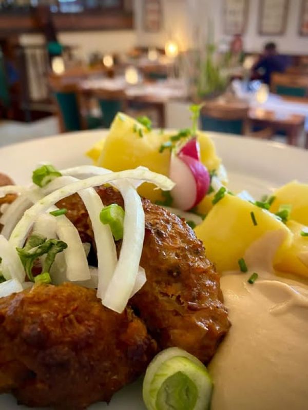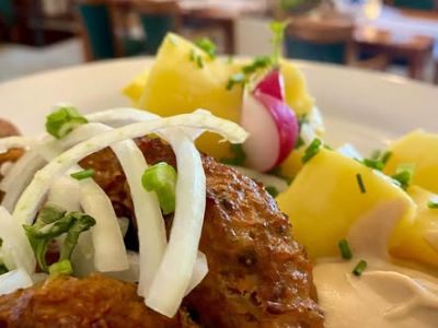 Čevabčiči s bramborovou kaší a cibulový salátkem s hořčicí
