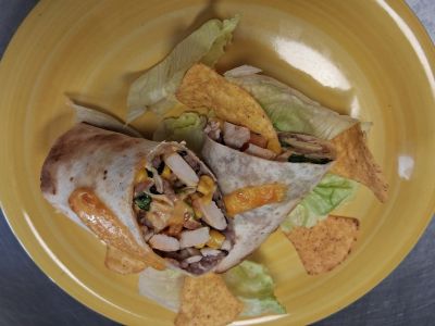 Menu 4 tortilla stripsová - Tortilla plněná, kuřecími stripsy, zeleninou a mozzarellou + hranolky + 1 x dip sweet chilli