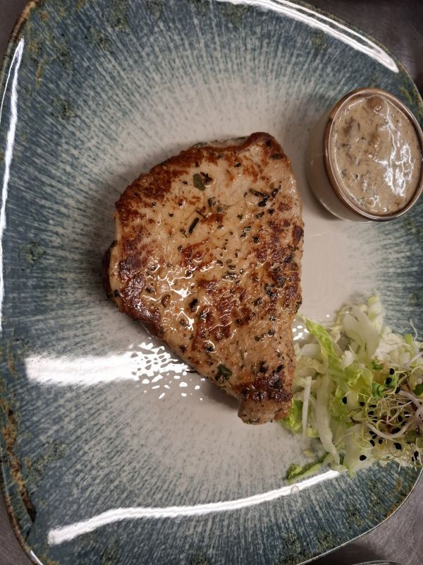 150 g Steak z vepřové pečeně, sázené vejce, pečené brambory s cibulí a fazolovými lusky (3, 7) 37