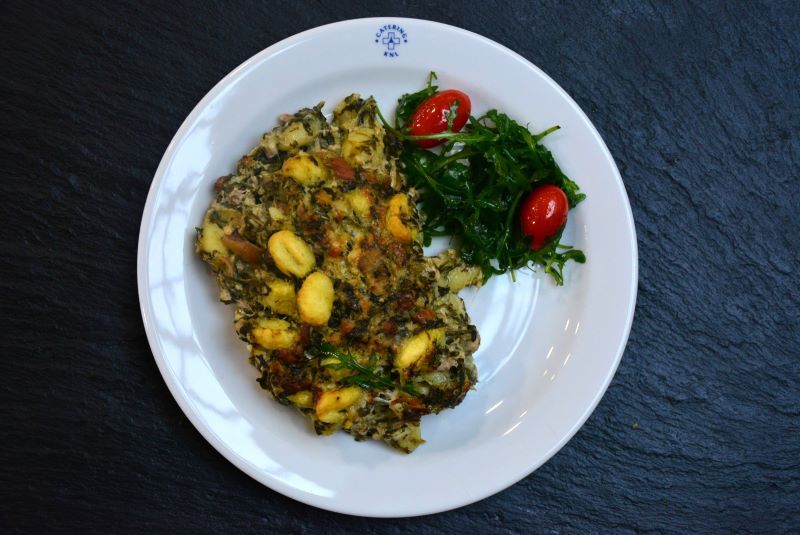nduja, hrášek, divoká brokolice, drobenka