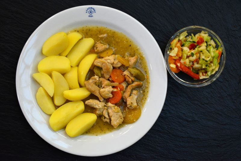 C. Pikantní kuřecí směs se zeleninou, hranolky 19