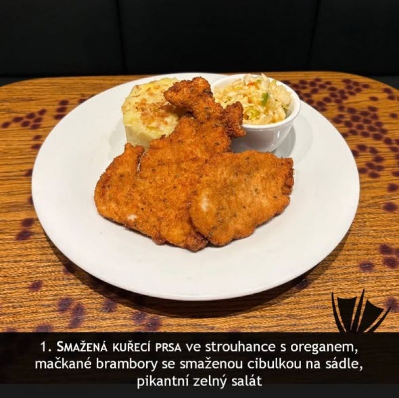 Menu dne Malá polévka Vývar s masem a nudlemi / Zelná bílá (zdarma) 150g Smažený kuřecí řízek v kukuřičných lupínkách, bramborový salát 1, 3, 7